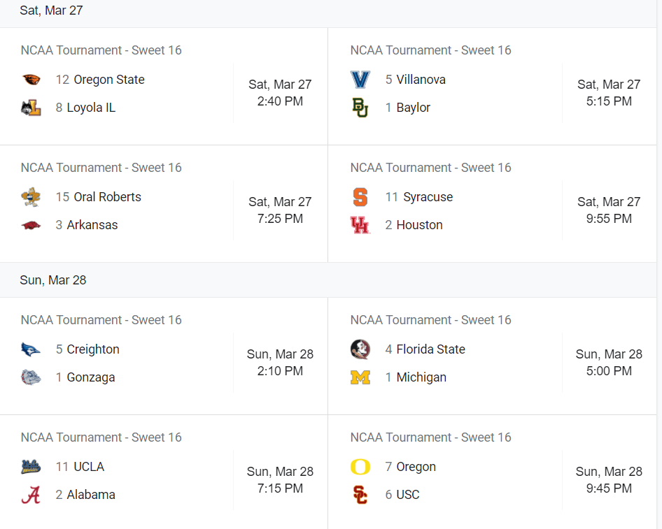 The Bonnies season may be over but the madness has not disappointed so far. We have four double-digit seeded teams in the sweet 16, and a one seed has already been bounced. The Big Ten has struggled in the tournament after having a strong regular season. The Big Ten landed 9 teams in the tournament and only Michigan is alive after the first two rounds. The Pac-12 has been the strongest with some big upsets along the way so far. UCLA, Oregon, USC, and Oregon State are still alive. The Pac-12 is 9-1 in the dance this year. Let’s break down the Sweet 16.