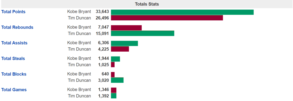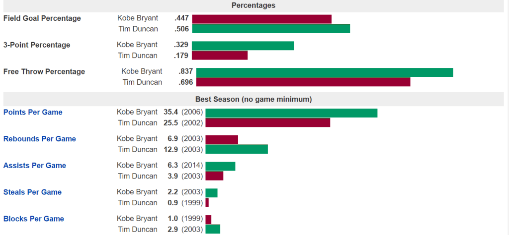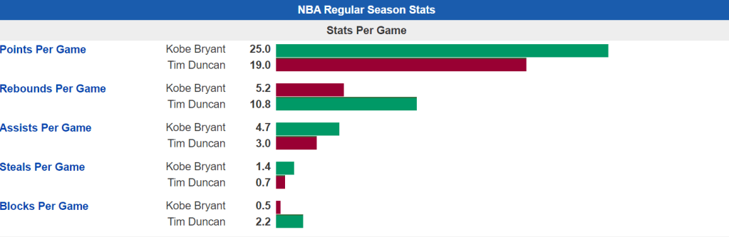 This got my attention. I am a huge Kobe Bryant fan and watched him since I was kid. Every week I would look to see who the Lakers were playing and would sneak downstairs to catch the 10:30 p.m. tip-off. It was difficult, obviously he played most games on the west coast. My fandom grew to me studying his moves and reading about his work ethic. One of the reasons I played basketball was because of Kobe Bryant. What has me so interested in this Hall of Fame class is, I remember the two Celtics-Lakers Finals in 2008 and 2010. They were my two favorite teams to watch. Garnett on the Celtics was the enforcer defensively, along with Rondo, Allen and Pierce leading offensively. Anyway, back to Kobe and Duncan. I am picking Kobe Bryant, and yes, I am a little bias. But I am going to get into the statistics and back myself up. I have the ultimate respect for Tim Duncan and what he accomplished and this is a very close call for me. Usually I don’t engage in basketball debates because they are so difficult to compare players. What fascinates me about this comparison is how similar the numbers and accolades are between the two. This is also almost impossible to compare them because they both play different positions, so lets try to dive into the impact they had on the game. I also want to touch on the team and coaches they have had and how much help one another played with. They also came in and left the league around the same time. So, without further a due lets get into it.
