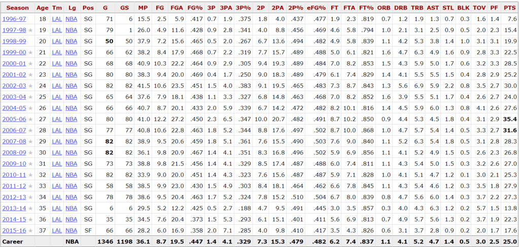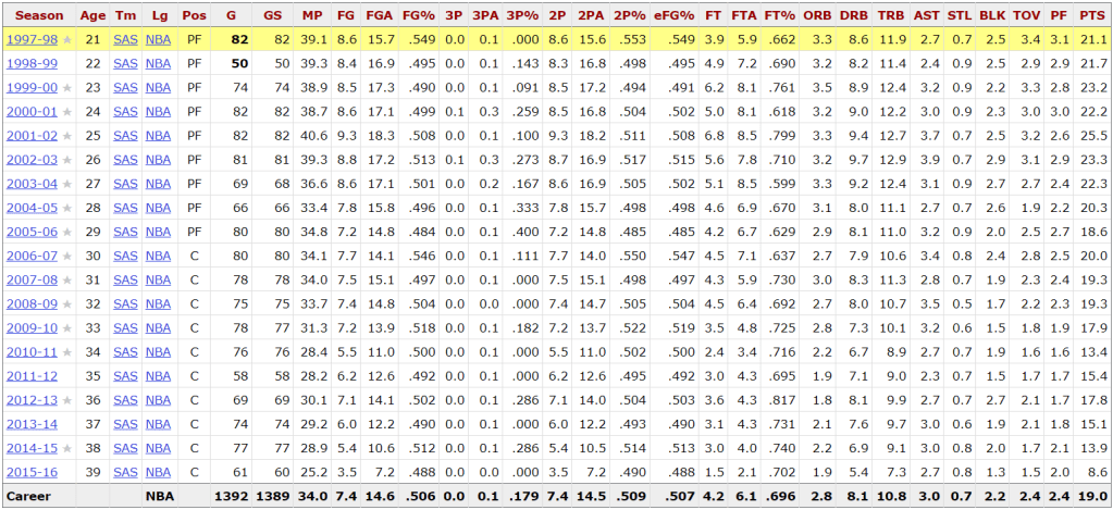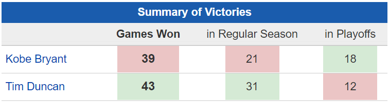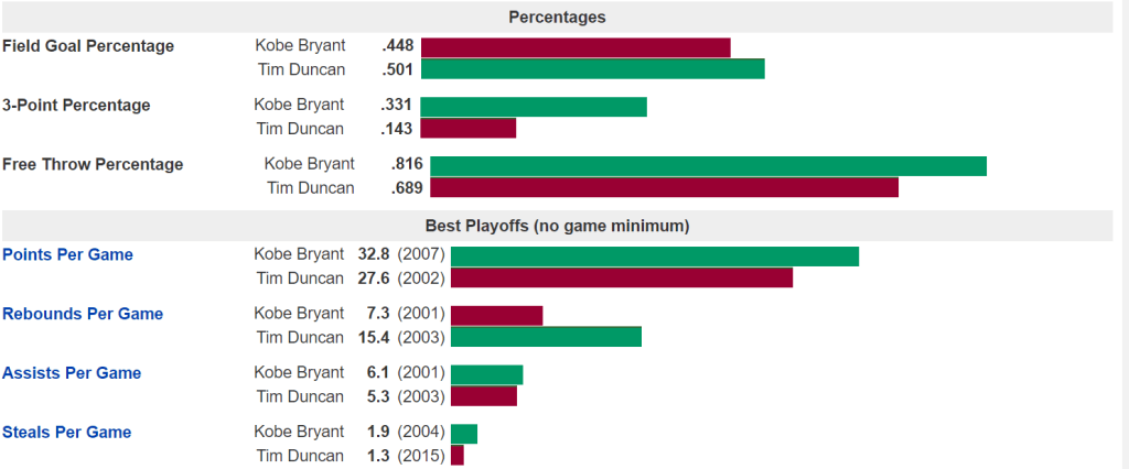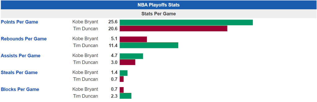 In the playoffs, Duncan has 18 appearances while Kobe has 15. Let’s look at the numbers: